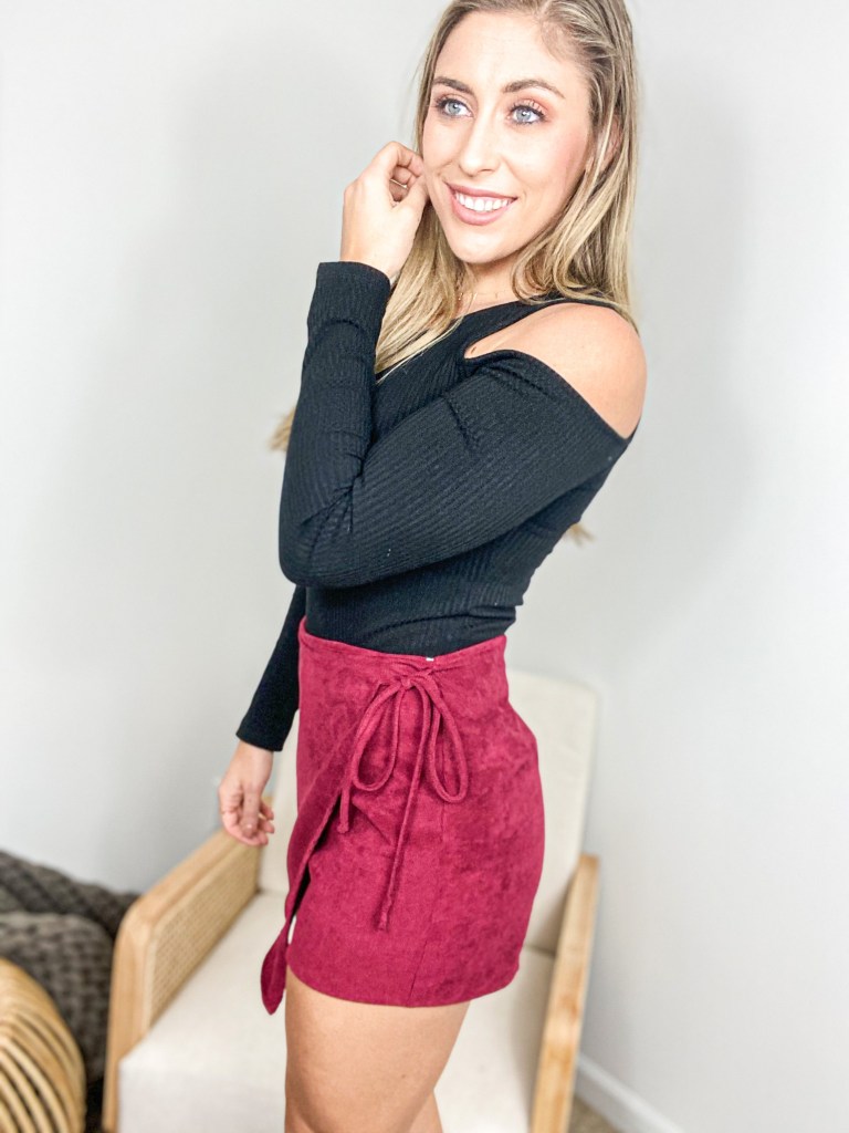 If you are a little more on the daring side and want a true statement piece, try a skirt or even a pant. Our Rory Faux Leather Skirt is the perfect statement piece. It is simple yet eye-catching. Pair it with a sweater or graphic tee.